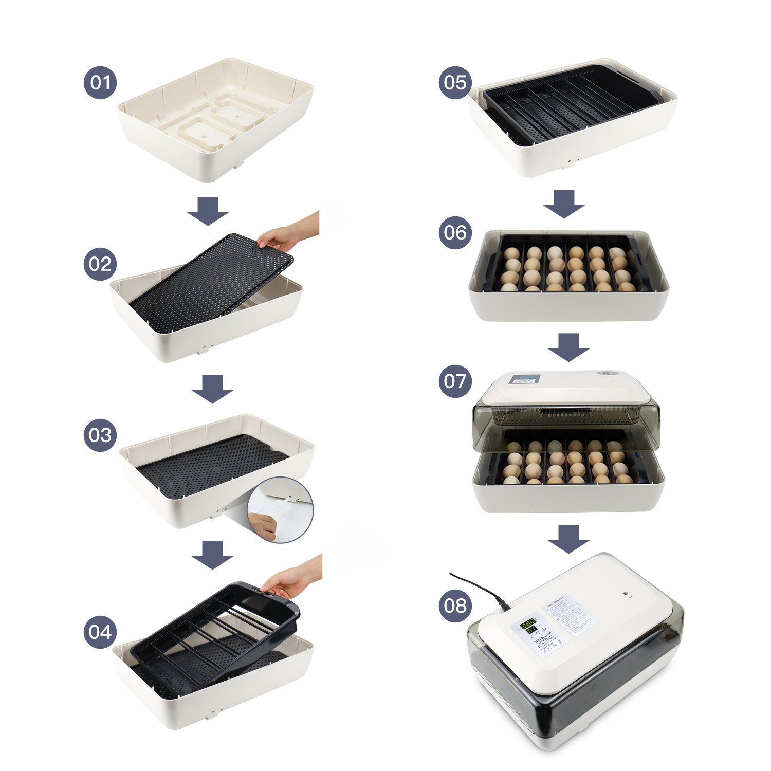 Para que su experiencia de eclosión sea aún más cómoda, nuestra incubadora viene equipada con una pantalla fácil de usar.Esta pantalla le permite monitorear y rastrear fácilmente la cantidad de días que sus huevos han estado incubando.Manténgase informado y en control durante todo el proceso, garantizando el mejor resultado posible para sus óvulos.