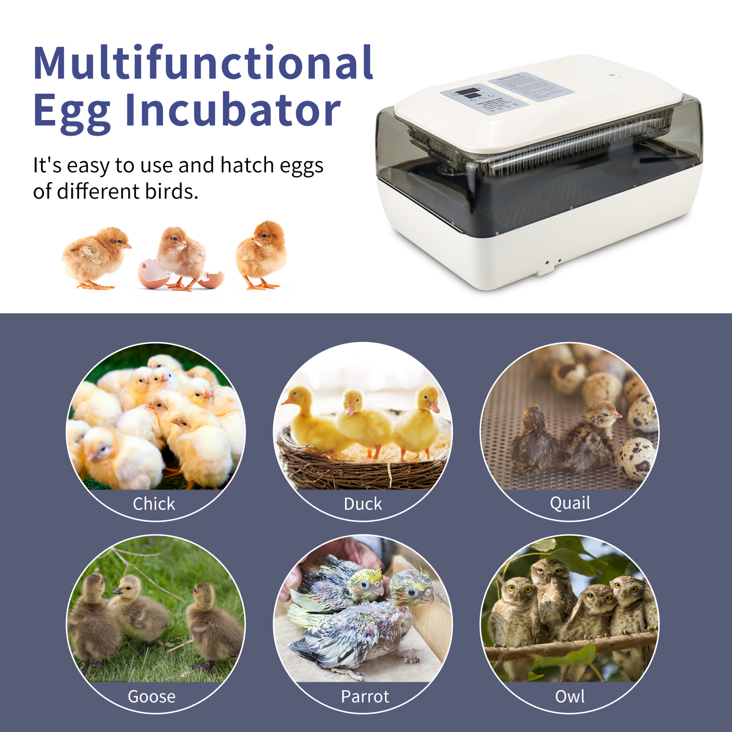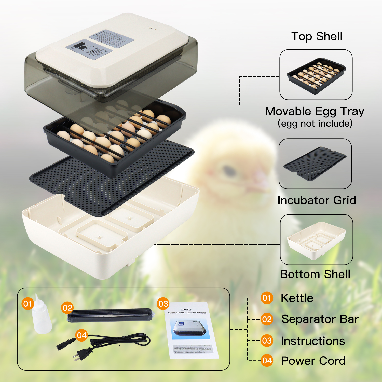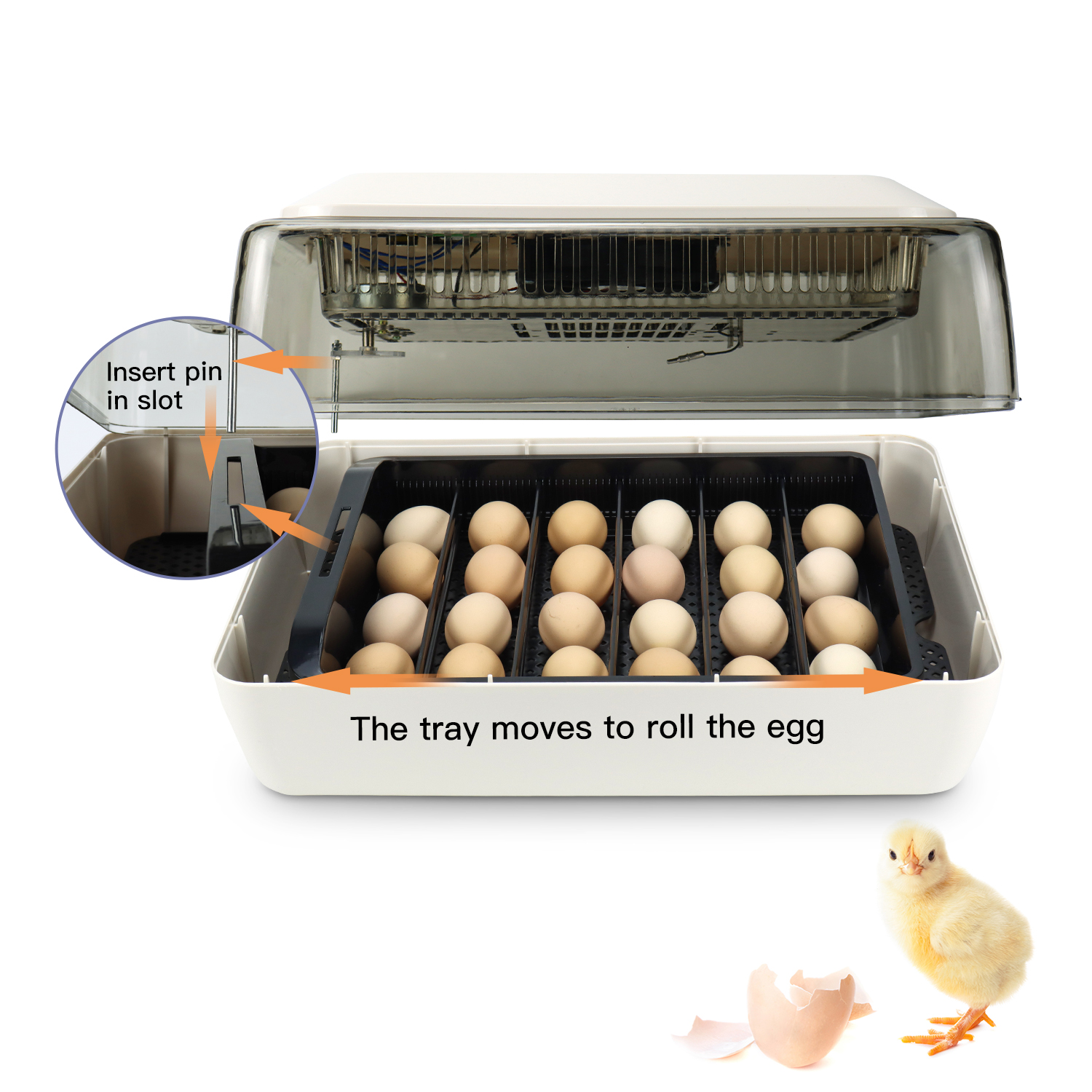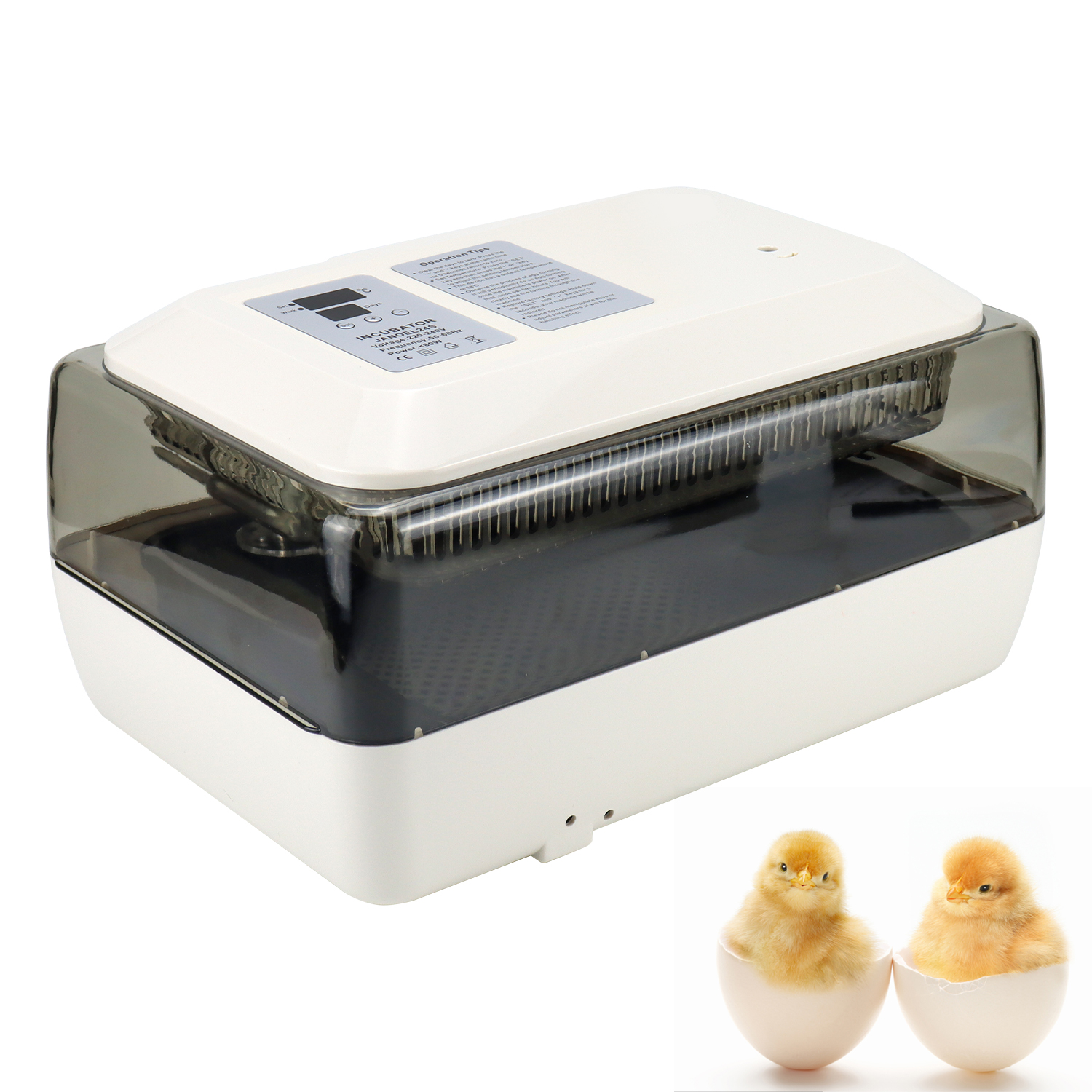 Presentamos nuestra incubadora de nivel profesional, la solución perfecta para todas sus necesidades de eclosión.Diseñada teniendo en cuenta la precisión y la eficiencia, nuestra incubadora puede acomodar hasta 24 huevos, lo que la hace adecuada para varios tipos de huevos, incluidos huevos de codorniz, gallina y pato.